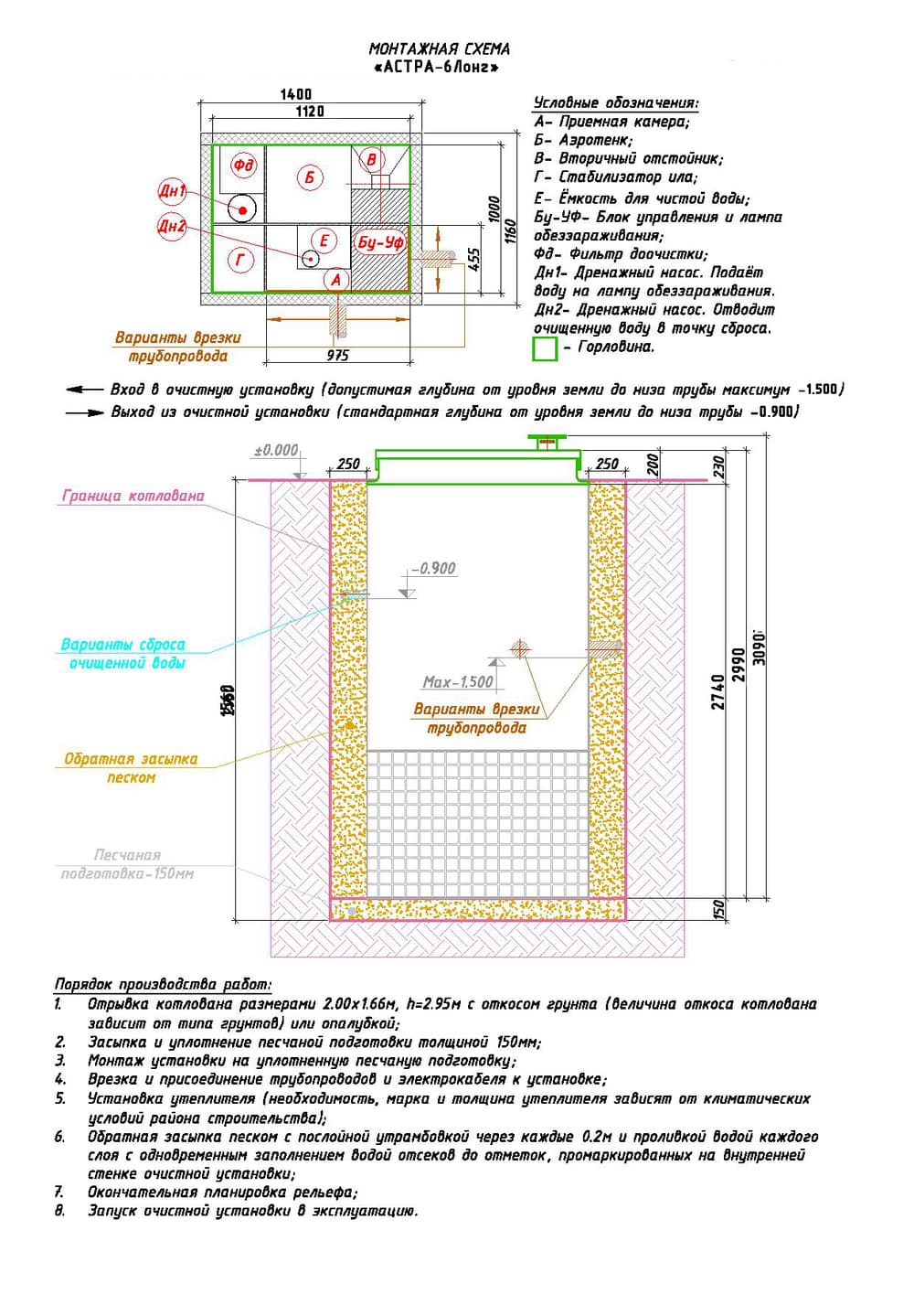 Отведение очищенных сточных вод самотеком в фильтрующий колодец, в условиях песчаных или супесчаных грунтов. При организации системы канализации Астра 6 в глине и суглинке или в условиях высокого уровня грунтовых вод - самотечное отведение в фильтрующий колодец, в случае переполнения с отводом воды на рельеф (в пределах границ частного домовладения, а за их пределами по согласованию с органами санитарного надзора) принудительно с помощью насоса.