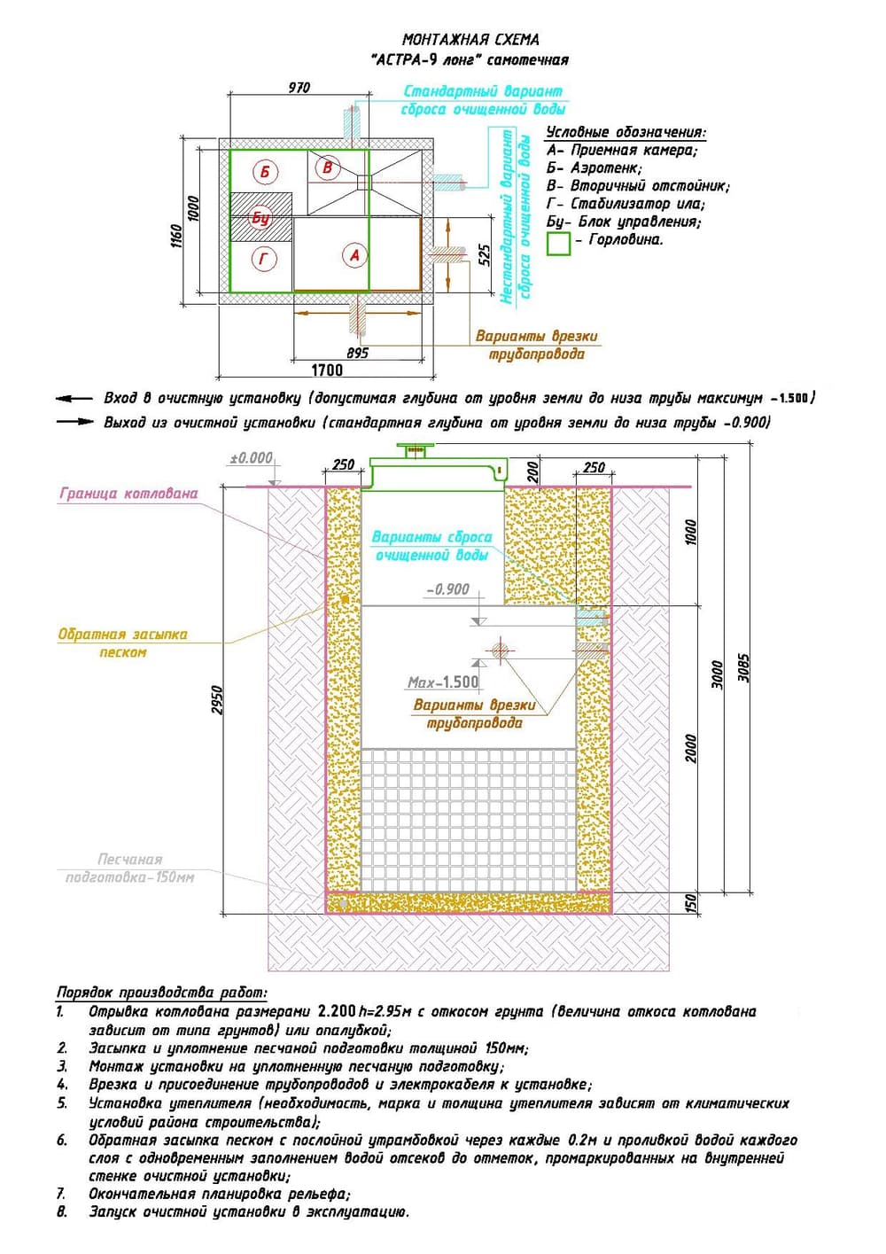 Отведение очищенных сточных вод самотеком в фильтрующий колодец, в условиях песчаных или супесчаных грунтов. При организации системы канализации Астра 9 в глине и суглинке или в условиях высокого уровня грунтовых вод - самотечное отведение в фильтрующий колодец, в случае переполнения с отводом воды на рельеф (в пределах границ частного домовладения, а за их пределами по согласованию с органами санитарного надзора) принудительно с помощью насоса.